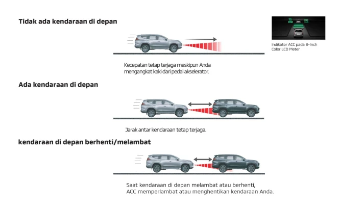 Menjaga jarak melalui radar dengan kendaraan di depan untuk meningkatkan kenyamanan berkendara terutama saat terjadi kemacetan. *Tersedia di semua varian Dakar & Dakar Ultimate