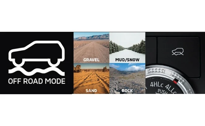 Traksi di jalan off road menjadi lebih baik dengan memilih mode Gravel (tanah berpasir), Mud/Snow (tanah berlumpur/bersalju), Sand (tanah berpasir) atau Rock (tanah berbatu).